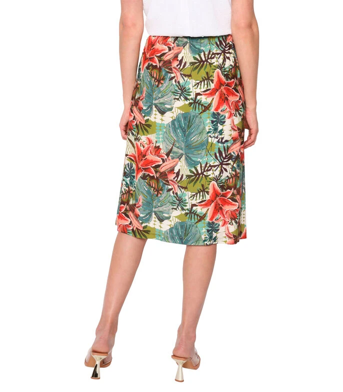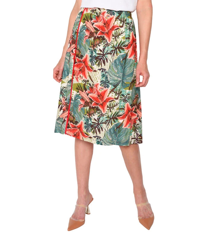 Falda midi Escorpión de corte recto en tejido de punto con estampado floral, detalle de línea a contraste en costado parte frontal, pretina elástica y detalle de olanes en parte inferior.