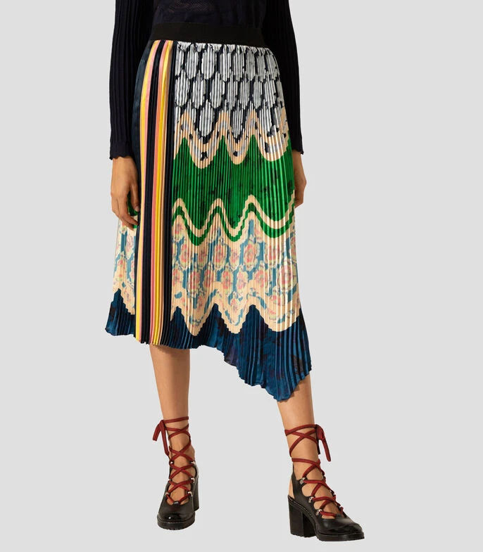 Falda midi Jazmin Chebar asimétrica de corte recto en tejido de punto con diseño plisado, estampado multicolor y elástico sobre cintura.