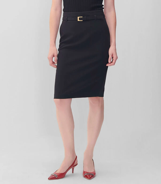 Falda Julio midi de corte recto; en tejido de punto liso con cinturón de hebilla metálica, costuras decorativas, cremallera discreta y abertura en parte posterior. Ya sea para una ocasión especial o simplemente para destacar en tu día a día, la Falda Julio es la elección ideal.