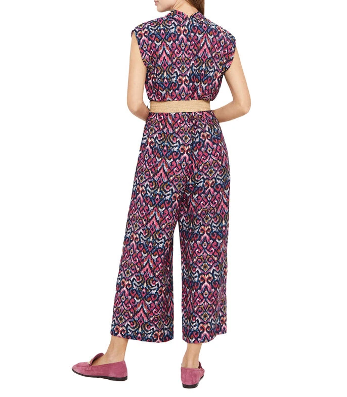 Jumpsuit Cortefiel de corte recto en tejido de punto con estampado fantasía, cuello V, escote cruzado, manga corta caída y cinturón trenzado.
