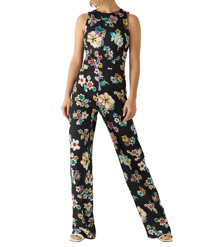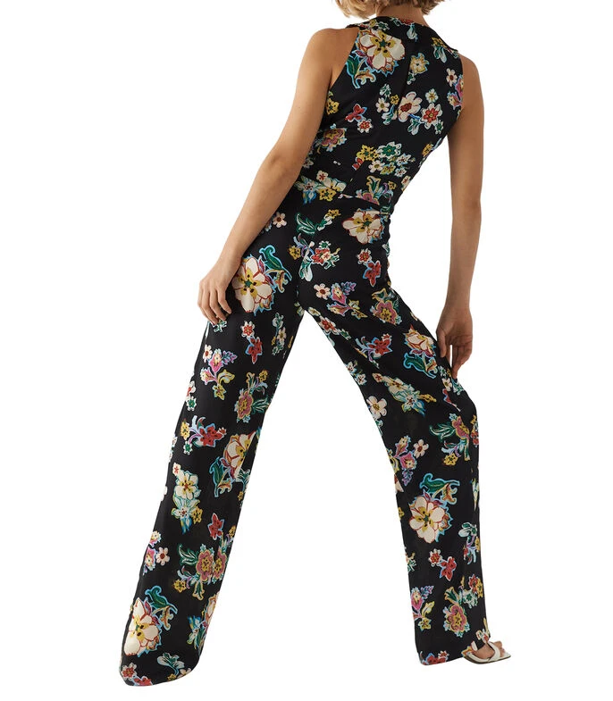 Jumpsuit Roberto Verino estilo palazzo de corte ajustado en tejido de punto con estampado floral, cierre de cremallera central en espalda y dos botones en cuello. Corte en cintura y pierna semi ancha.