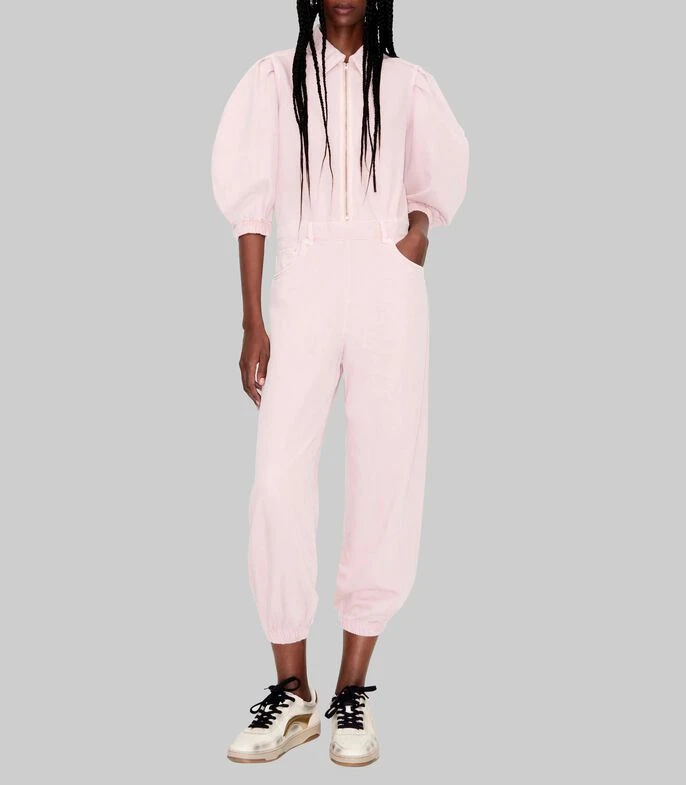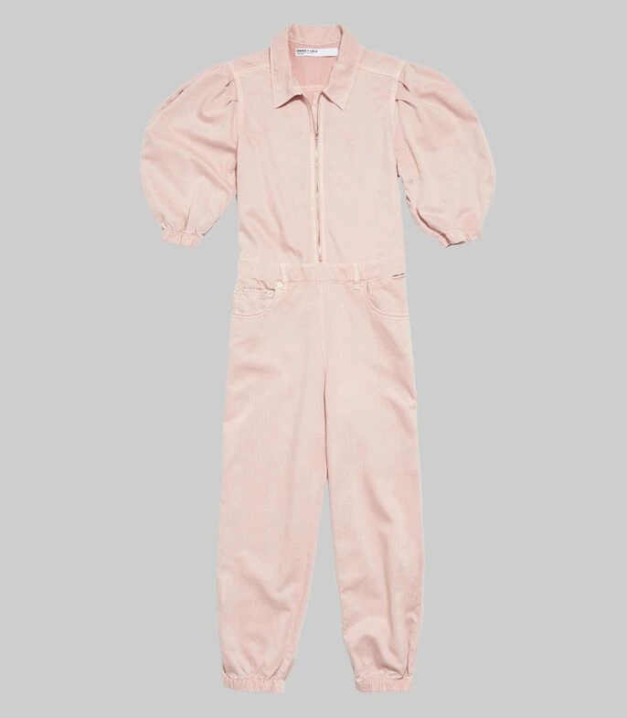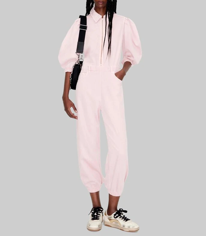 Jumpsuit Bimba y Lola de corte recto en mezclilla, cuello camisero con cierre frontal, manga 3/4 abullonada, remaches metálicos, trabillas para cinturón, bolsillos en costados y en la parte posterior.