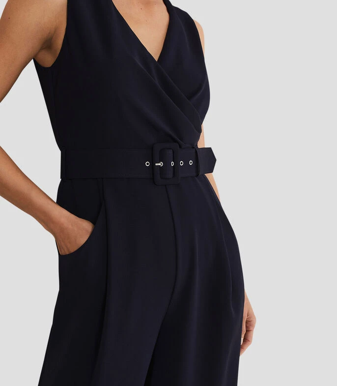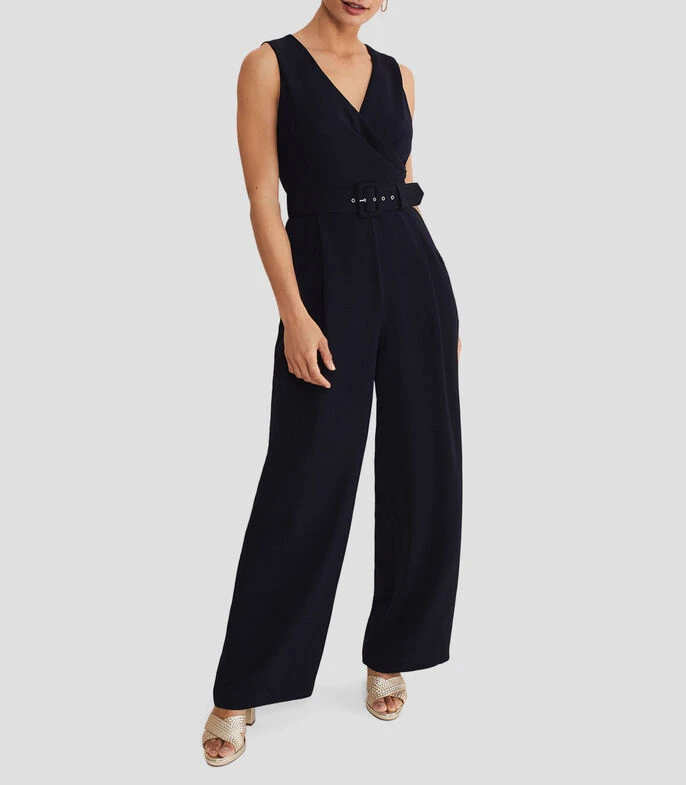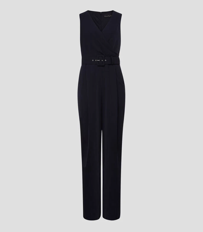 Jumpsuit Phase Eight de corte regular en tejido de punto con diseño liso, cuello V, sin mangas, cinturón en cadera a tono y cierre en espalda.