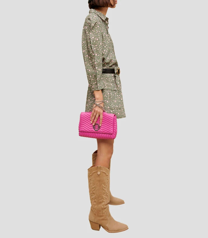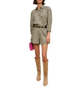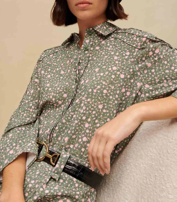 Camisa Maje de corte recto en tejido de punto con flores, cuello camisero, botonadura a tono al frente, hombros abullonados, abertura en costados y manga 7,8.