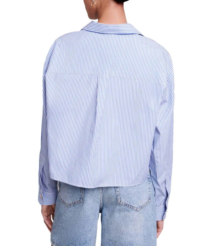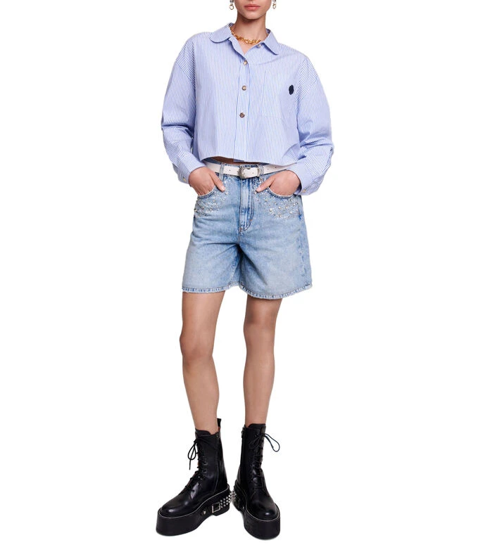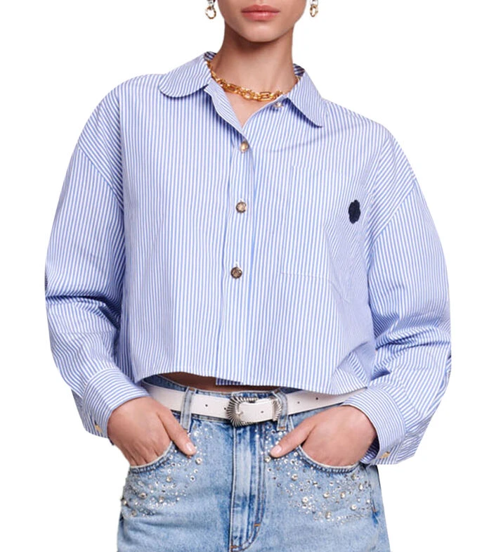 Camisa Maje de corte regular en tejido de punto con cuello Peter Pan, diseño de rayas, bolsillo tipo parche, logo bordado a contraste y cierre frontal de botones.