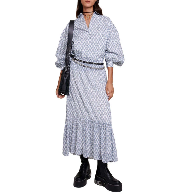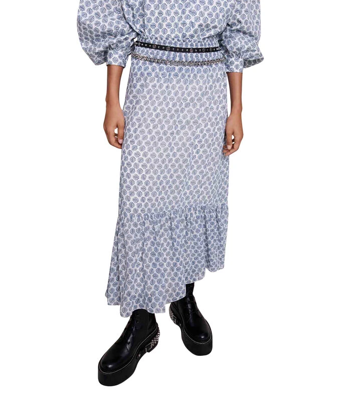Falda maxi Maje de corte recto en tejido de punto con diseño monogram, detalle de pliegues, aplicación de volantes en parte inferior.