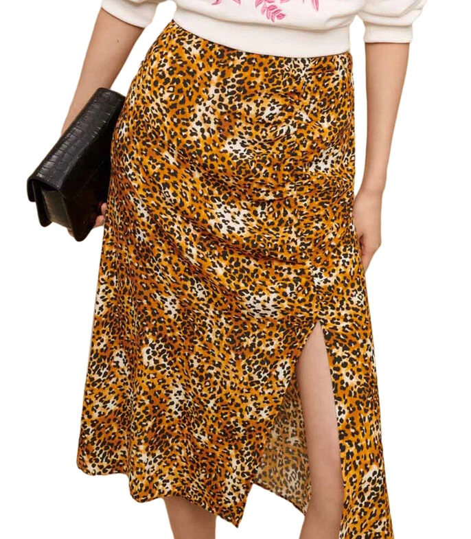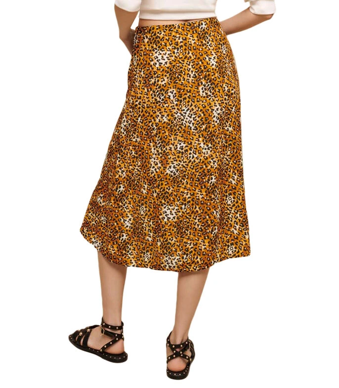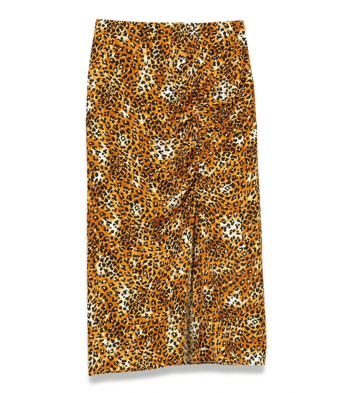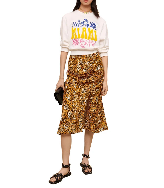 Falda midi Maje de corte recto en tejido de punto con estampado animal print y abertura en parte frontal.