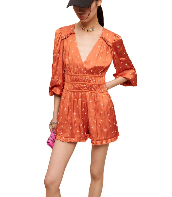 Jumper Maje de corte recto en tejido de punto, acabado satinado, cuello V, detalles decorativos en hombros, costuras en cintura, y manga larga abullonada.