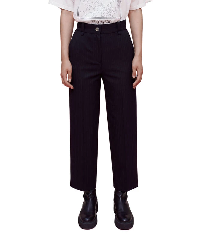 Pantalón Maje Pilena de corte recto en tejido de punto; Rayas de tiza ligeramente contrastantes, bolsillos inclinados en la parte delantera, cremallera oculta, botón a presión Trébol Maje de metal plateado oscuro.