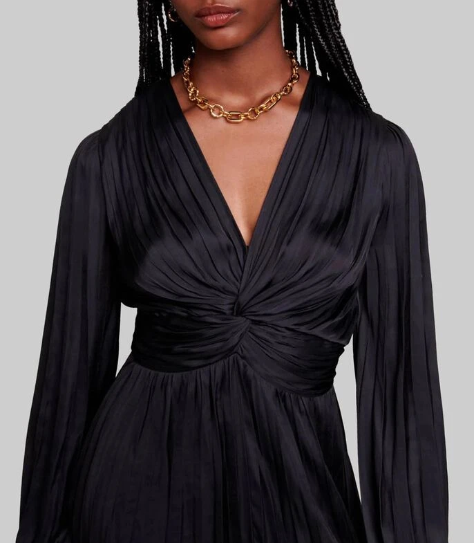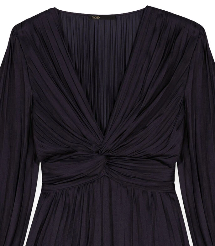 Vestido Maje corto de corte recto; en tejido de punto liso con acabado brillante, escote V, manga larga tipo abullonada, elástico en puño y pliegues que parten de la cintura.