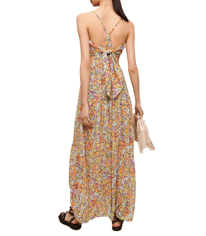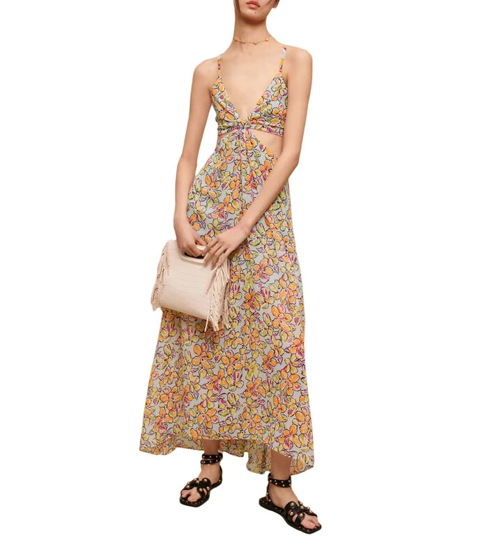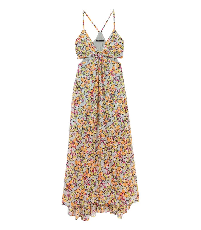 Vestido Maje Midi de corte A en tejido de punto, cuello y escote V, tirantes delgados, cintura descubierta y flores multicolor. Cinta para anudar en espalda. Un lindo y pintoresco detalle para lucir en verano.