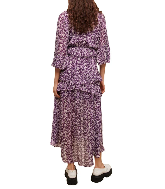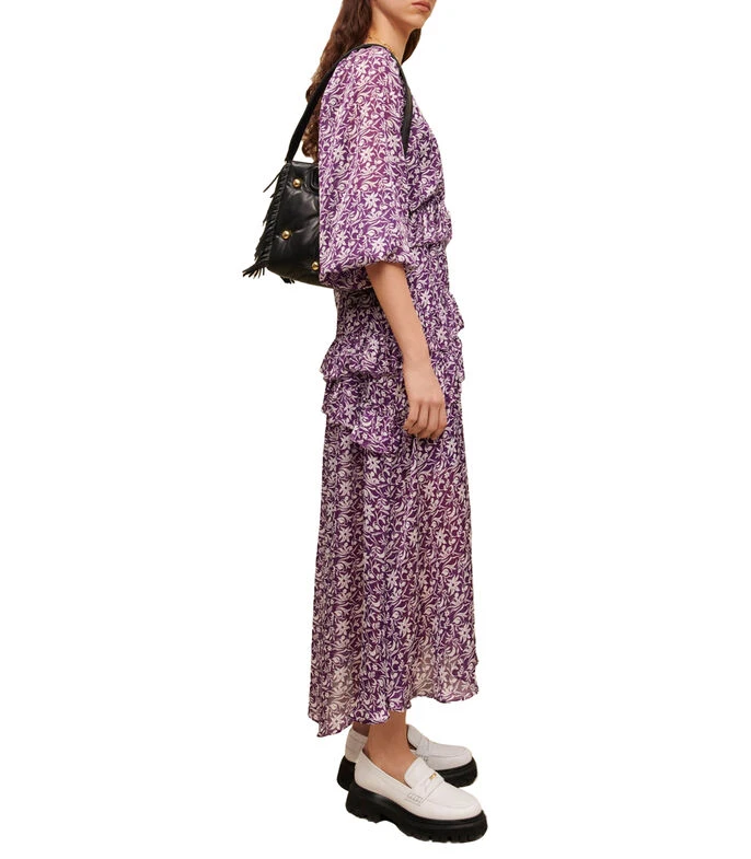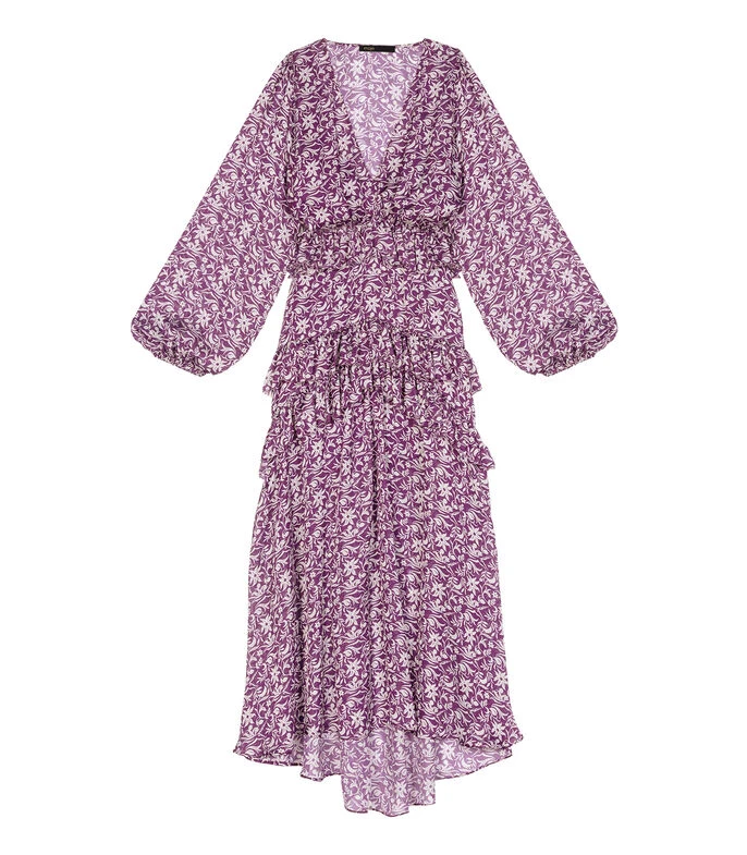 Vestido Maje midi de corte recto en tejido de punto, cuello V, manga 3/4 elásticas, olanes y estampado floral. Una prenda perfecta para los días calurosos.