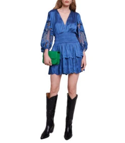 Vestido Maje mini con plisados; Apuesta por la elegancia con este vestido mini de corte recto, lleno de detalles chic rockeros. Con escote en V de croché y cintura fruncida, también tiene manga de tres cuartos adornada bajo bordados calados que dejarán entrever la piel. Sutiles fruncidos en los hombros, su falda acampanada está adornada de volantes y bordes festoneados para darle un toque de estilo a tu silueta.