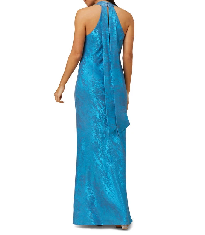 Maxi vestido Aidan by Aidan Mattox de corte Sirena en tejido de punto con diseño irregular, cuello halter y cintas decorativas en espalda.