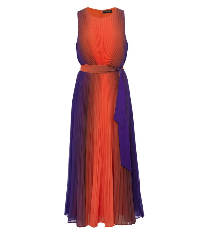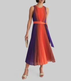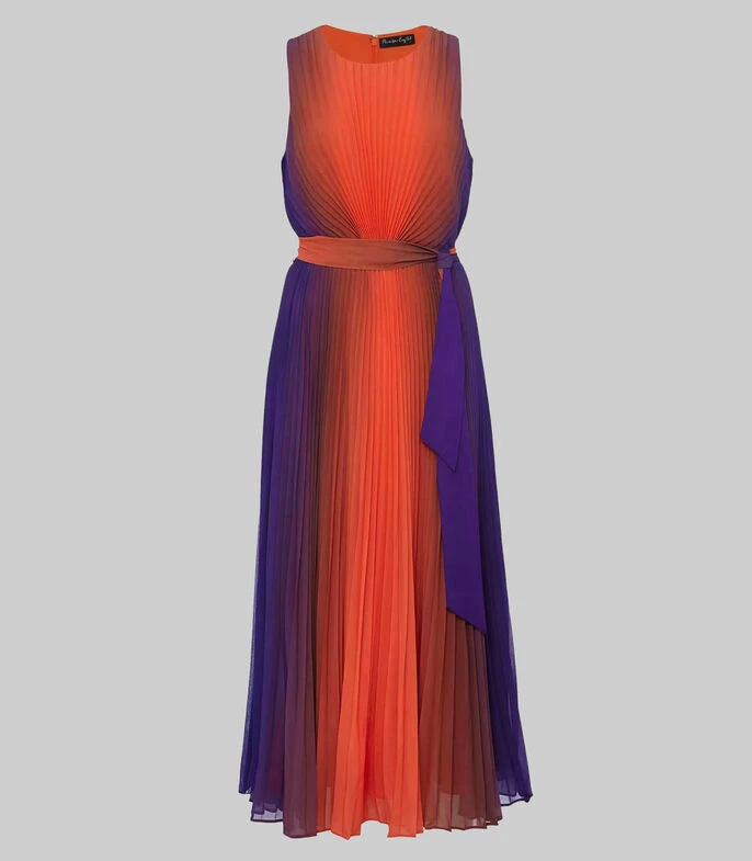 Maxi vestido Phase Eight Simara de corte regular en tejido de punto plisado con diseño degradado, cuello redondo, tirantes anchos, cierre en espalda y cinta de amarre; Nuestro muy querido vestido Simara vuelve en una nueva paleta de colores degradados. Diseñado con un llamativo estampado y textura plisada en toda la prenda, nuestro vestido incluye un detalle de lazo en la cintura para realzar tu figura. Combínalo con tacones dorados y un bolso de mano a juego en tu próximo evento especial para atraer todas las miradas.
