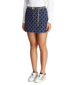 Falda corta Michael Kors de corte recto en mezclilla, con trabillas para cinturón, cierre de botón con cremallera, bolsillos, remaches metálicos, diseño de monogram y cinturón de cadena.