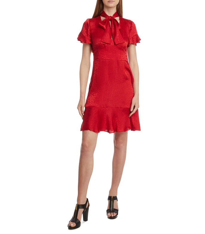 Vestido midi Michael Kors de corte recto en tejido de punto con estampado tonal de animal print, cintas ajustables al cuello y cierre en lateral.