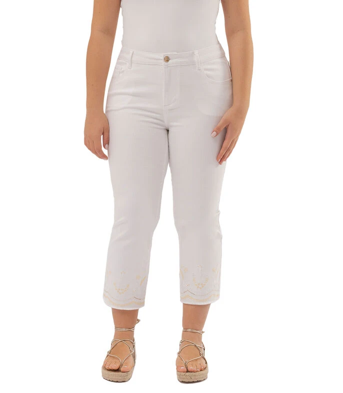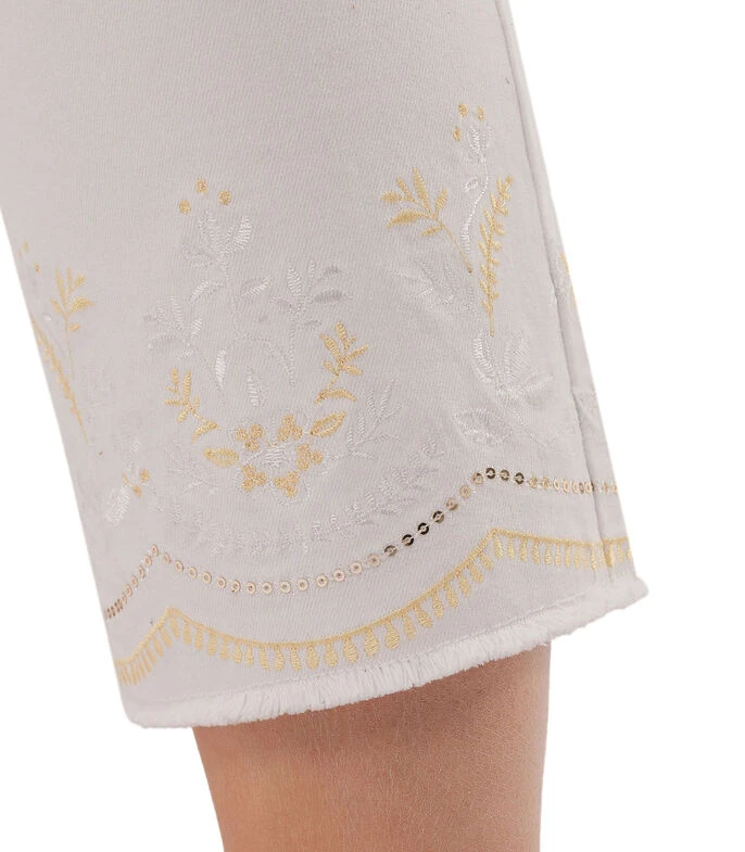 Pantalón October estilo capri de corte recto en tejido de punto con cremallera y detalles bordados en tobillos.