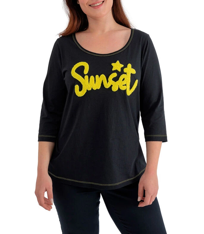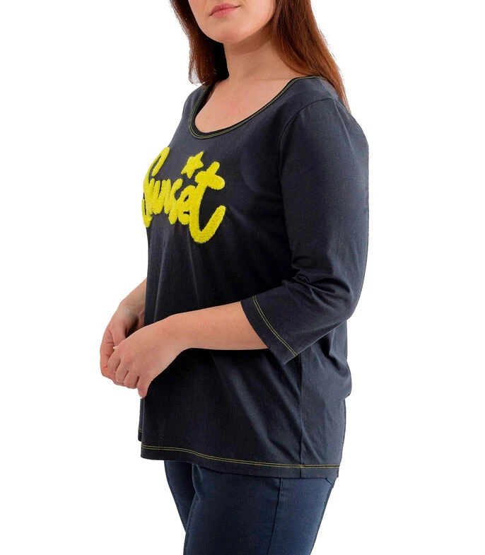 Playera October de corte regular en tejido de punto, cuello redondo y manga 3/4. Detalle de letras en rizo en la parte delantera y pespuntes a contraste.