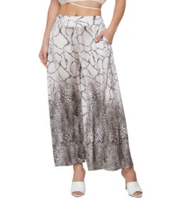 Pantalón Acampanado Spirito en tejido de punto satín, estampado tipo animal print contraste, tablones al frente, bolsillos en costados y pretina elástica.