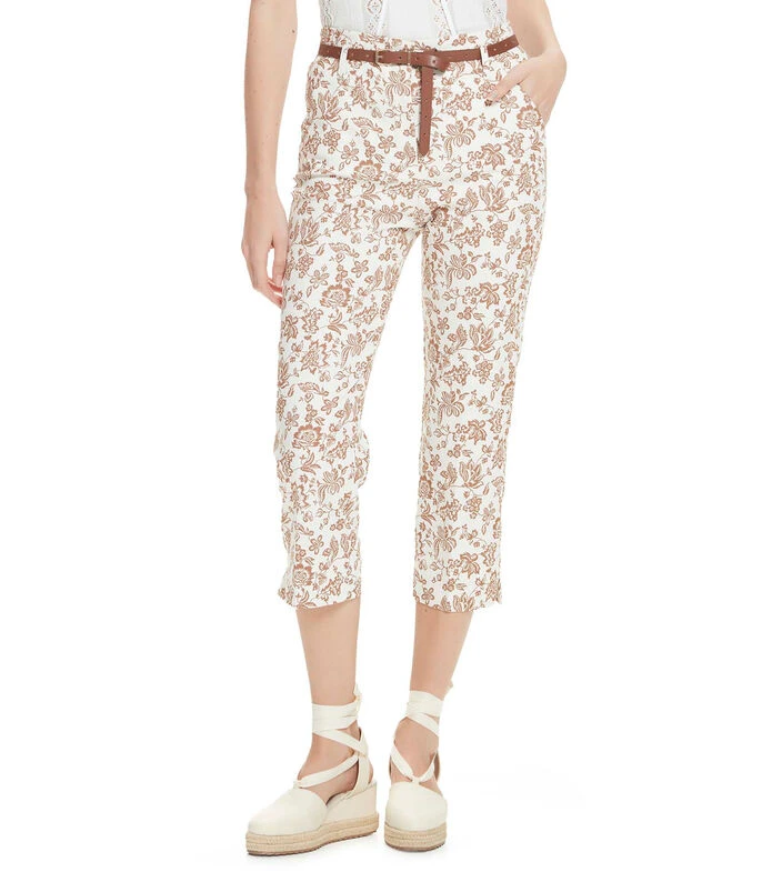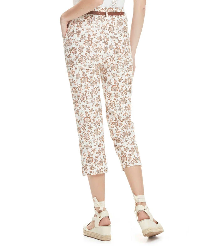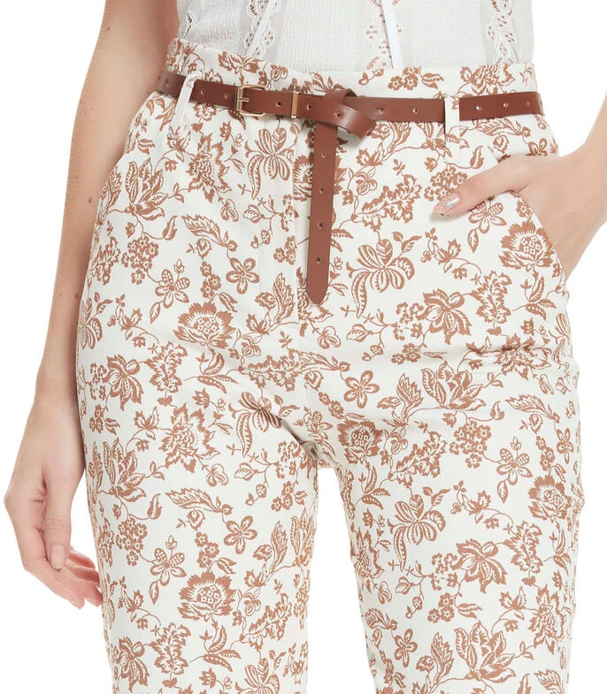 Pantalón Julio de la Colección Creta de corte recto en tejido de punto con estampado floral, tiro alto y bolsillos diagonales al frente.