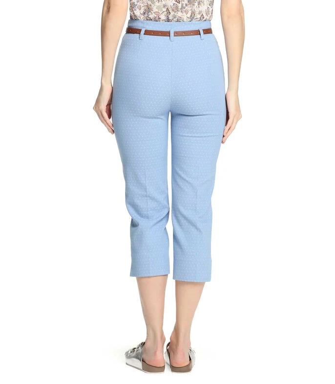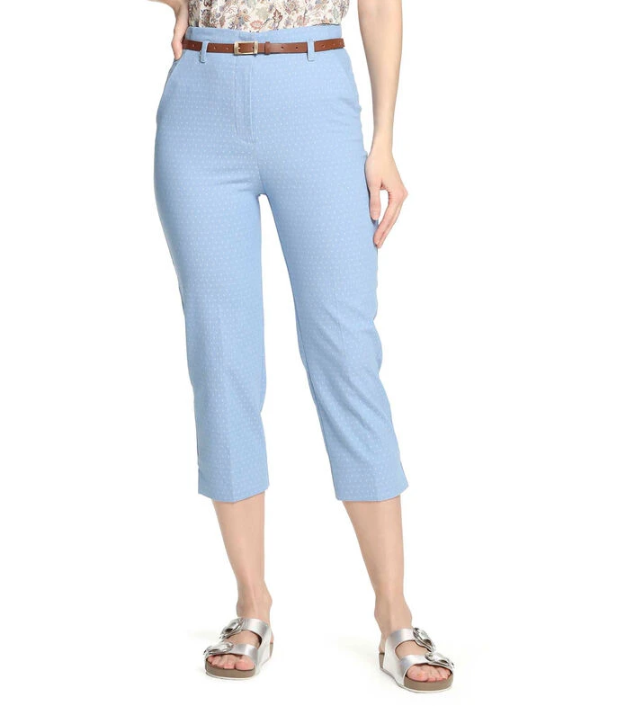 Pantalón Julio de corte recto en tejido de punto, detalle de mini rombos, tiro alto, bolsillos diagonales al frente y cinturón largo con efecto piel en contraste sobre cintura.
