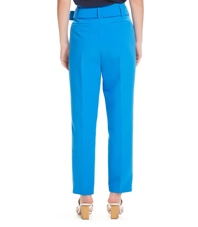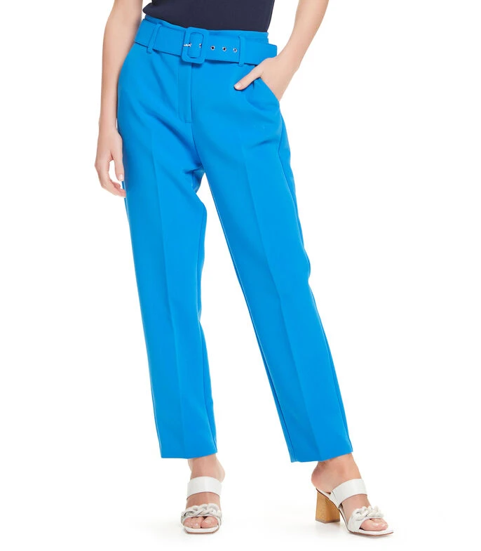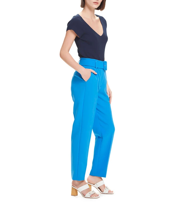 Pantalón Julio entubado de corte recto, tiro medio con bolsillos diagonales. Pretina con trabillas y cinturón forrado. Cierre de broches de gancho y cremallera. Sarga ligera con stretch.