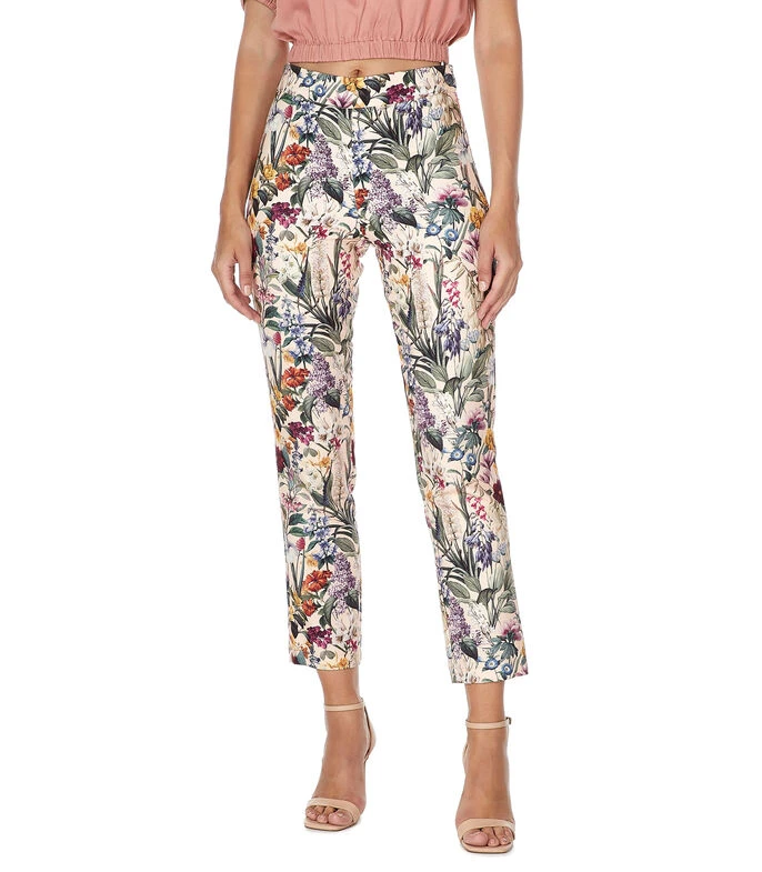 Pantalón Octavia de corte recto en tejido de punto con estampado floral y cierre de cremallera lateral.
