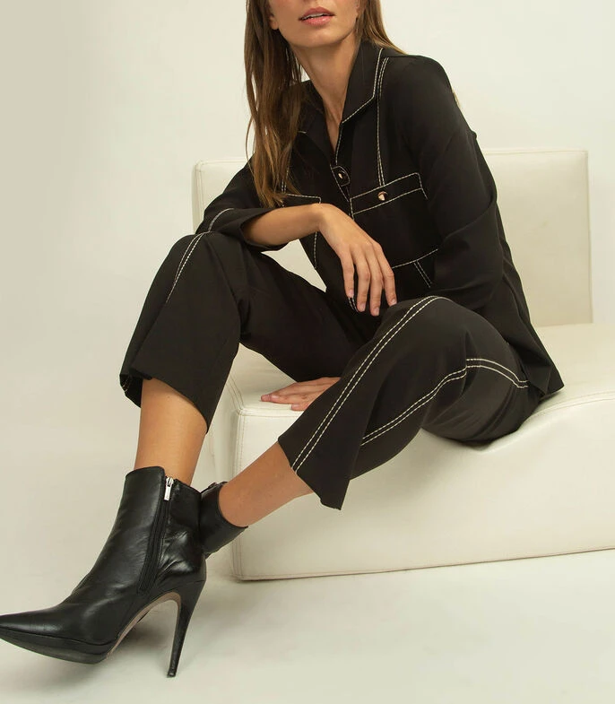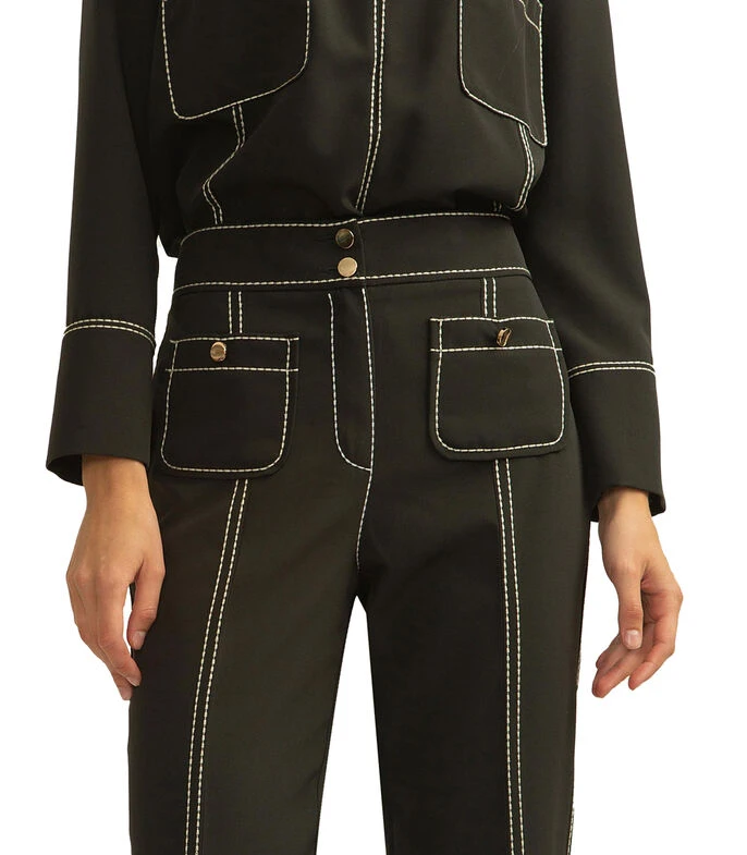 Pantalón Alba Conde de corte recto en tejido de punto, botonadura al frente y pespuntes a contraste.
