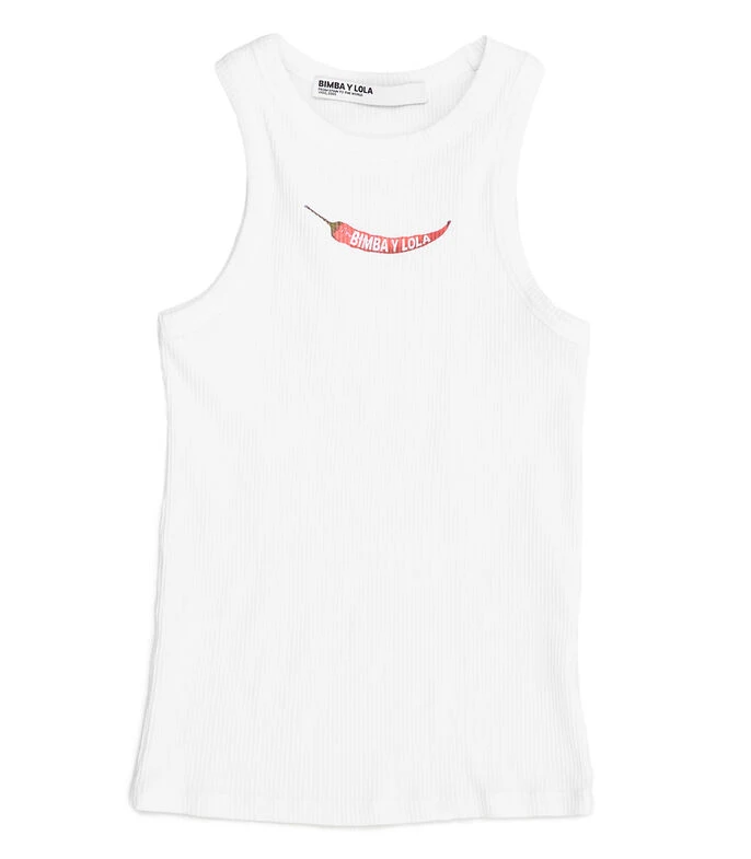 Playera Bimba y Lola de corte regular en tejido de punto, cuello redondo, sin mangas, estampado en pecho con forma de chile a contraste.