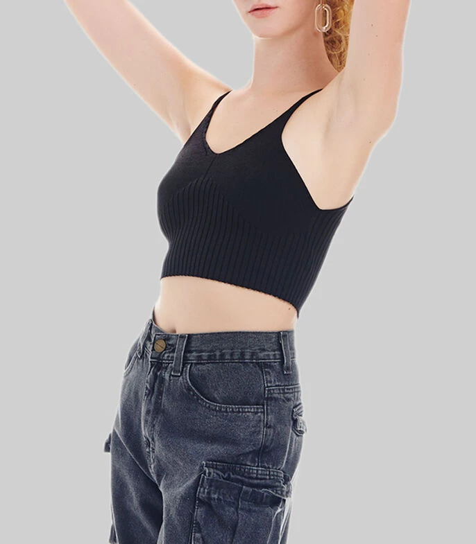 Playera Unfollow de corte crop en tejido de punto canalé con diseño liso, sin mangas y cuello V.
