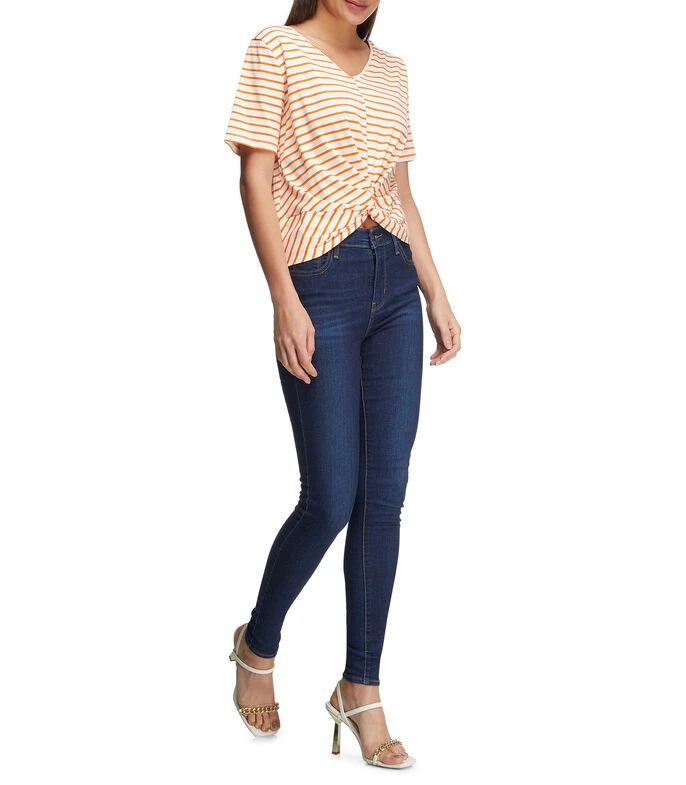 Playera Chester & Peck de corte regular en tejido de punto, cuello «V», manga corta, estampado de rayas horizontales a contraste y nudo decorativo inferior.