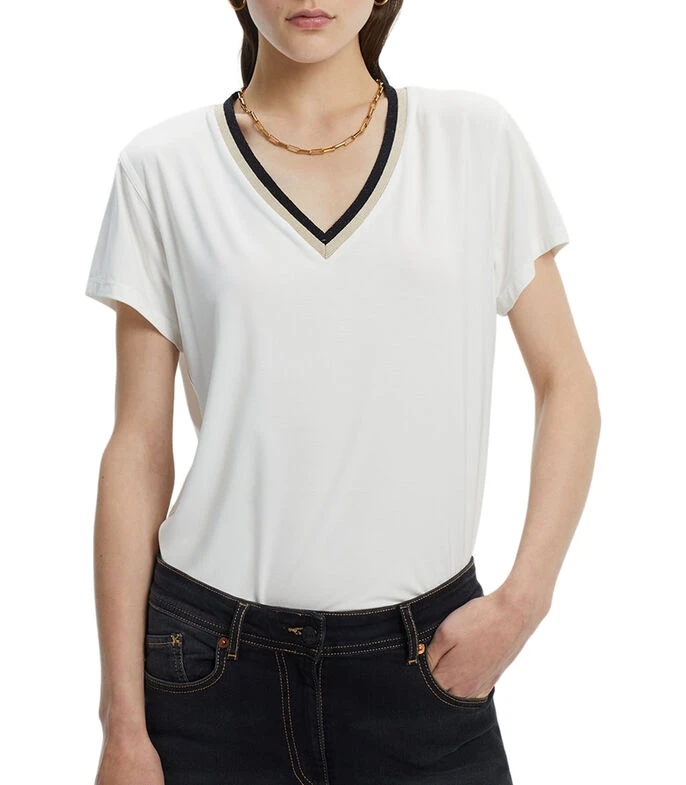 Playera Andam de corte regular en tejido de punto, cuello V con franjas a contraste y manga corta.