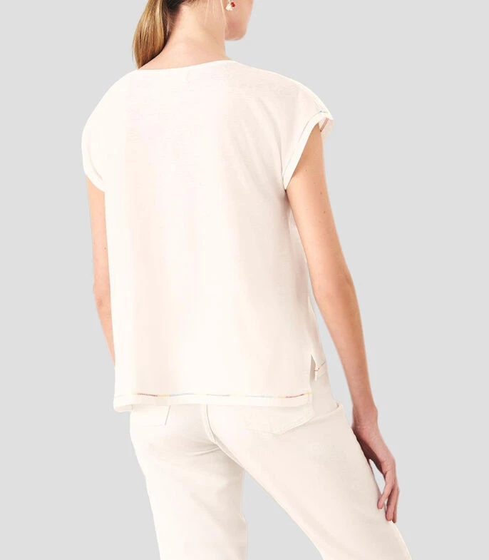 Playera Rapsodia de cuello redondo sin mangas y estampada; Playera de corte holgado y confeccionada en suave jersey de trama fina. Tiene un estampado central con detalles bordados a tono. El toque lo aporta las terminaciones en las costuras sobre las mangas, realizadas en hilo multicolor. Combínala con pantalón blanco para un total look súper cool.