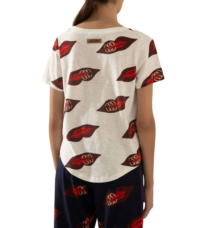 Remera Jazmin Chebar confeccionada en tejido 100% algodón estampado con diseño de bocas. Escote en V amplio tejido a tono y con manga corta. Corte amplio súper femenino. Completa el conjunto la Babucha Kisses.