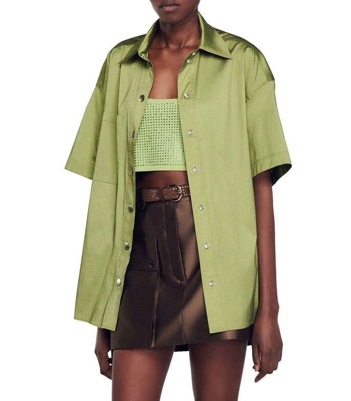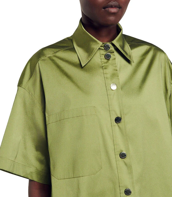 Camisa Sandro de corte regular en tejido de punto satinado con botones y bolsillo de parche.
