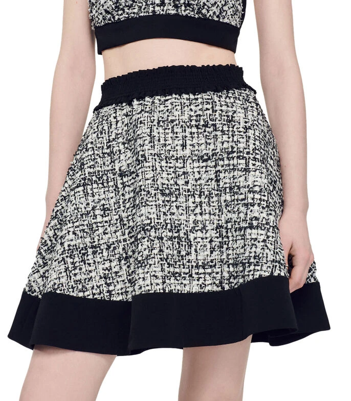 Falda corta Sandro de corte «A» en tejido plano, con diseño fantasía y detalles a contraste.