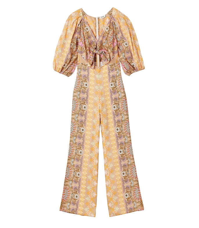 Jumpsuit Sandro de corte recto en tejido de punto, estampado paisley, abertura al frente con moño decorativo en pecho.