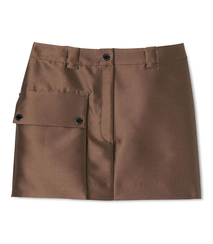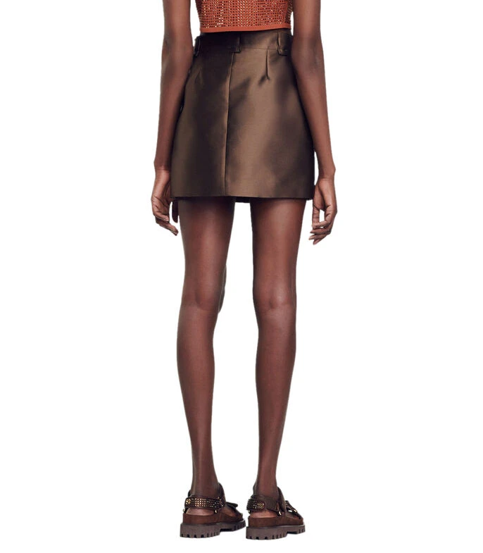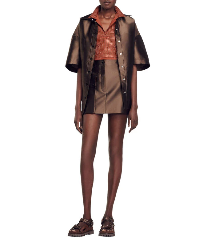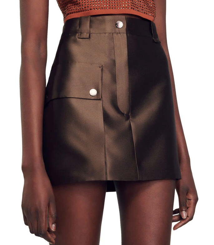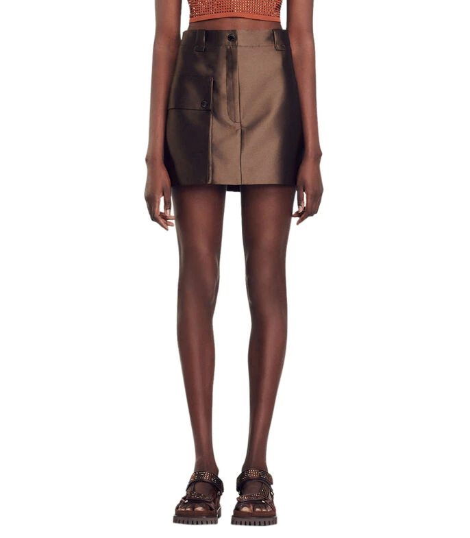 Minifalda Sandro de corte recto en tejido plano, acabado metalizado con trabillas, líneas a tono, botones a contraste y cierre de cremallera.