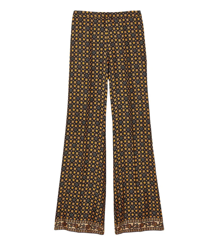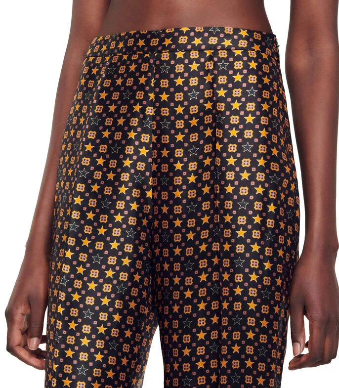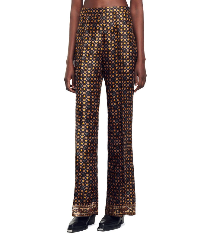 Pantalón acampanado Sandro en tejido de punto con multidiseño y pretina elástica.