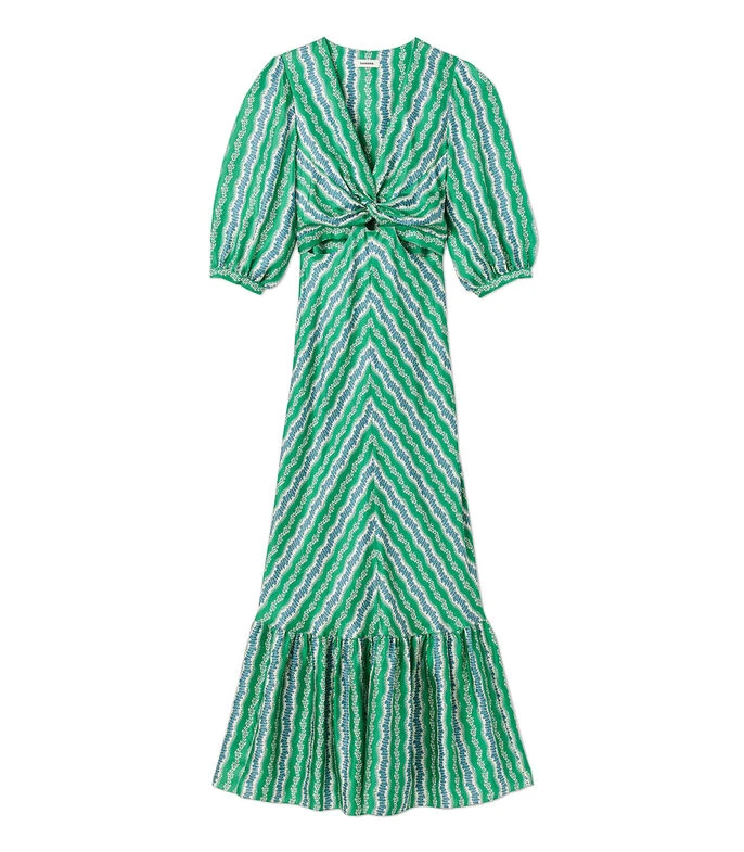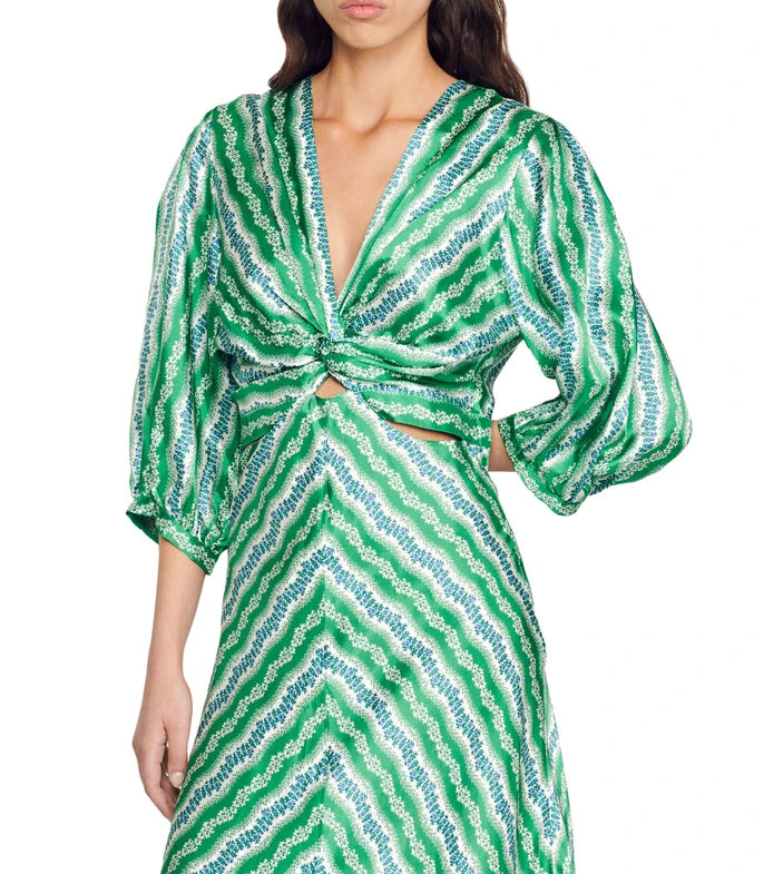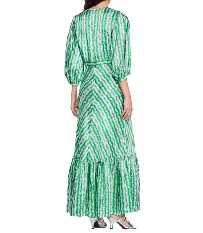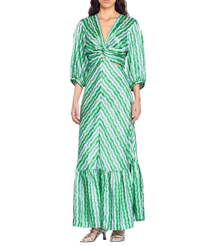 Vestido Sandro maxi de corte recto en tejido de punto con rayas, cuello V, fruncido en pecho, sutiles aberturas al frente y manga 7/8.