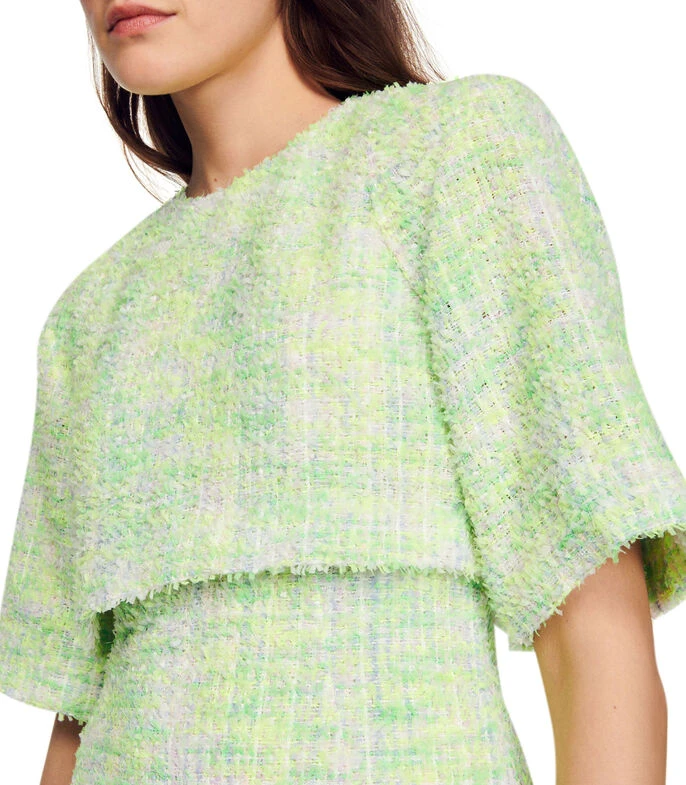 Vestido Sandro de corte ajustado en tejido de punto, textura, diseño jaspeado, siluetas de color, pliegue en cintura y cremallera en espalda.