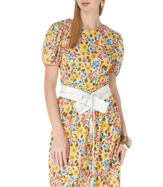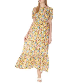 Vestido Springfield maxi de corte recto en tejido de punto con estampado floral, cuello redondo, manga corta y un botón en la espalda.