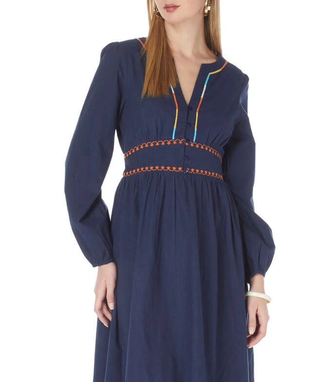 Vestido Springfield midi de corte recto en tejido de punto con botones a tono, detalles bordados, cuello redondo, manga larga, elástico en cintura y puños.