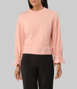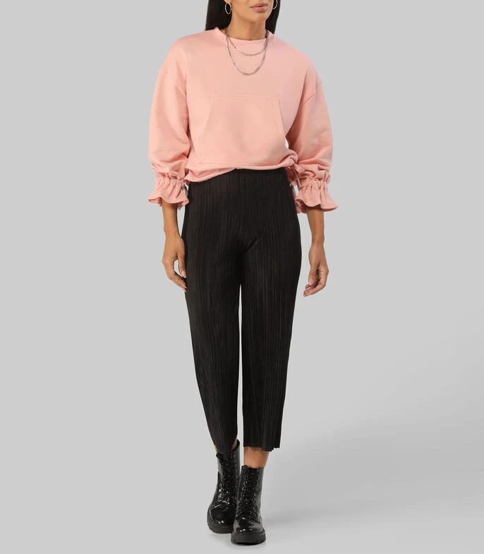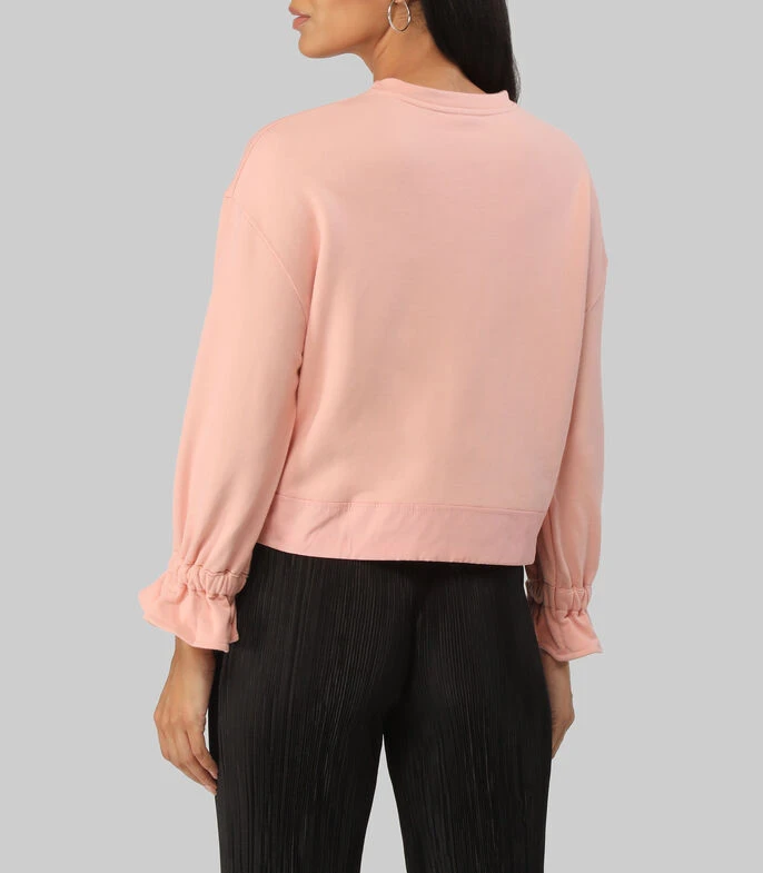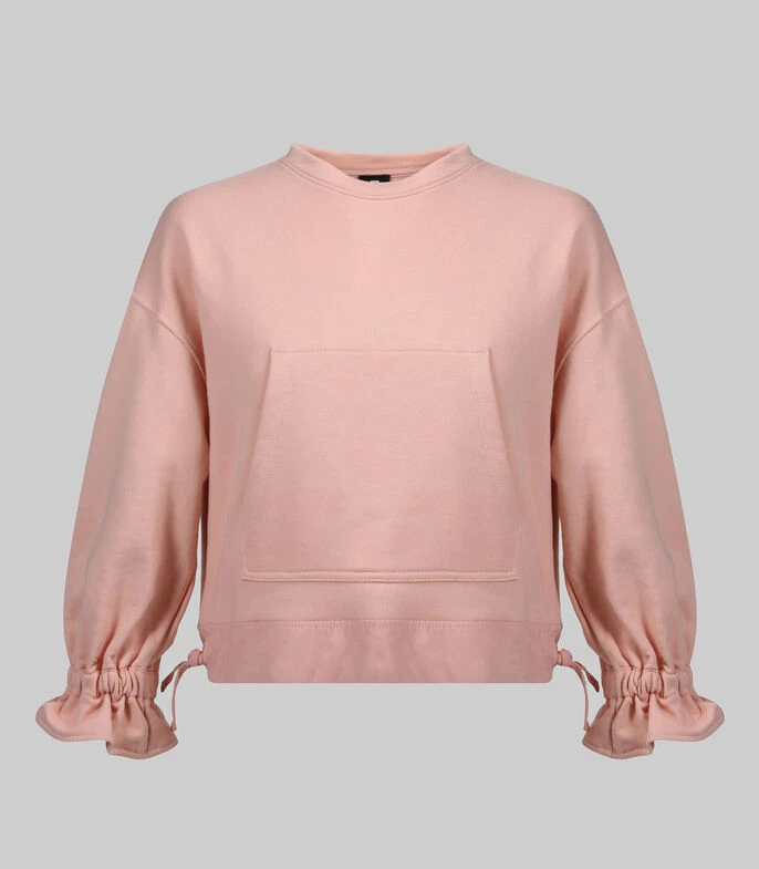 Sudadera Unfollow oversized, escote redondo, manga larga con puño enresortado y campana; bolsillo canguro y ruedo combinado con jaretas.