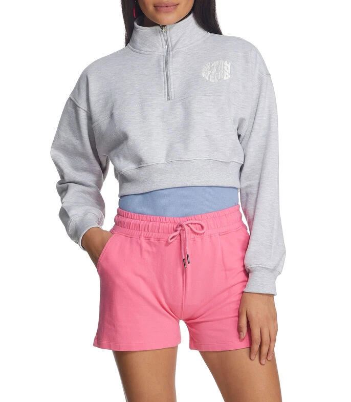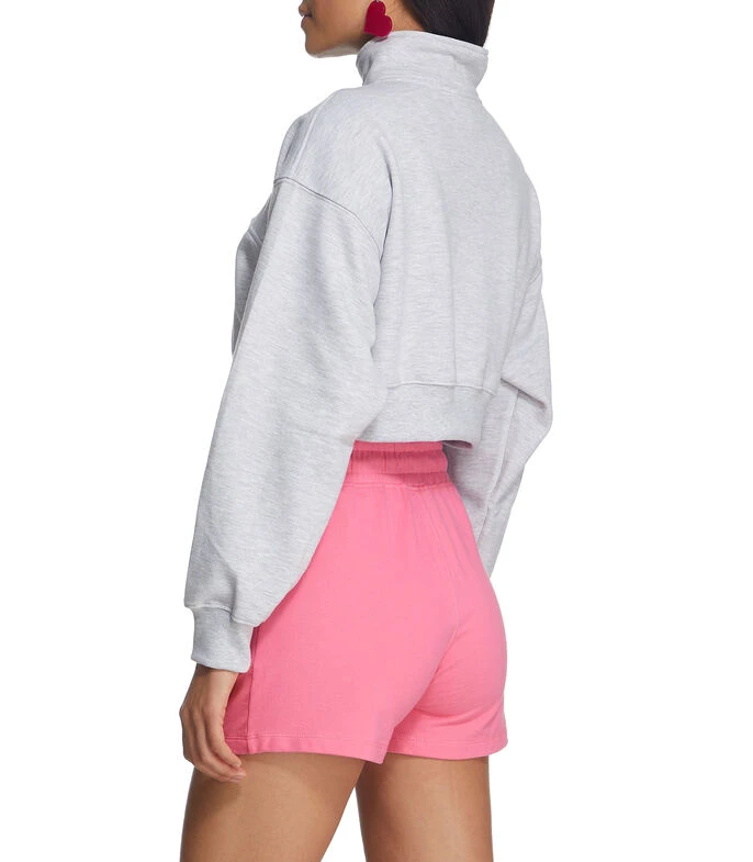 Sudadera Crop Top Catamaran de corte recto en tejido de punto jaspeado, cuello alto, manga larga, bordado en pecho a contraste y bordes acanalados.
