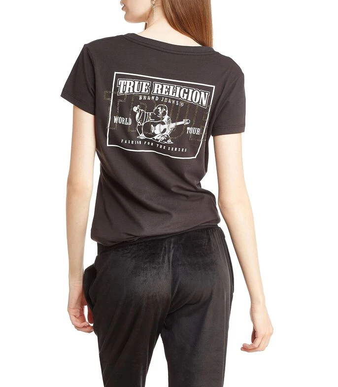 Playera True Religion de corte Regular en tejido de punto con logotipo de pedrería al pecho y multidiseños sobre espalda.