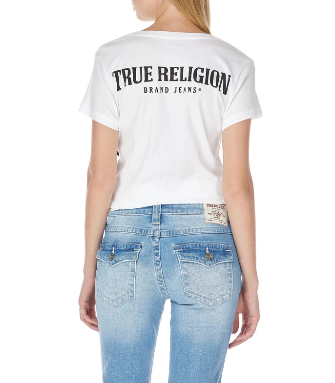 Playera True Religion de corte regular en tejido de punto, cuello V, logotipo de la marca decorado con pedrería en cuello, manga corta y nombre de la marca estampado en espalda.