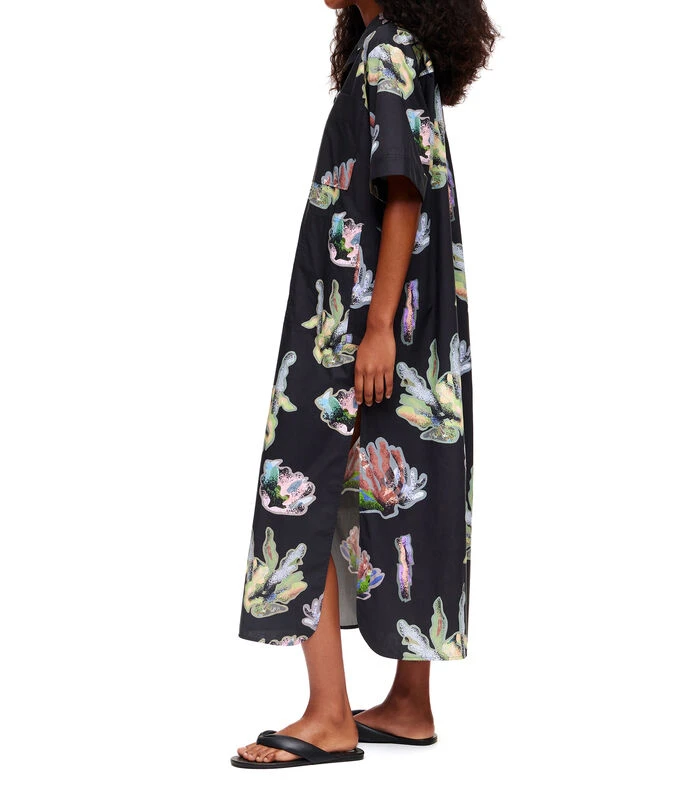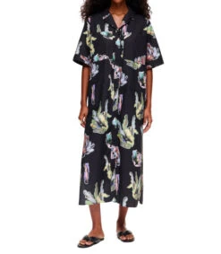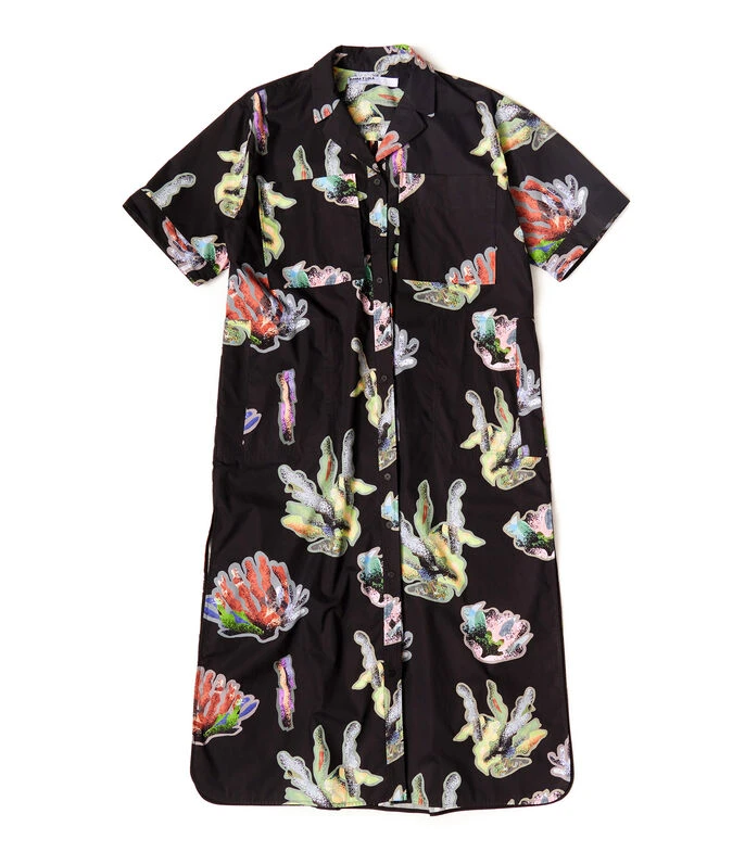Vestido Bimba y Lola midi de corte camisero en tejido de punto, cuello camisero con botones a tono, manga corta y estampado coral a contraste.