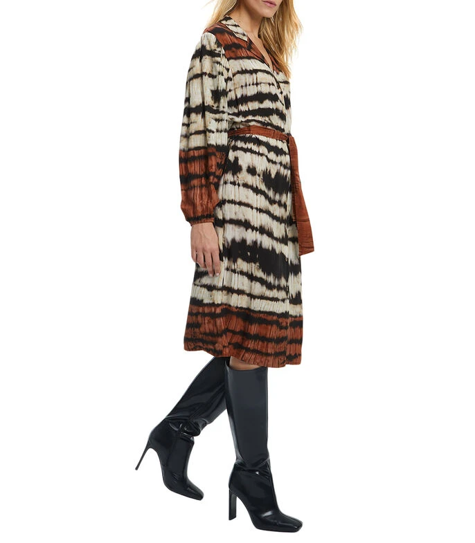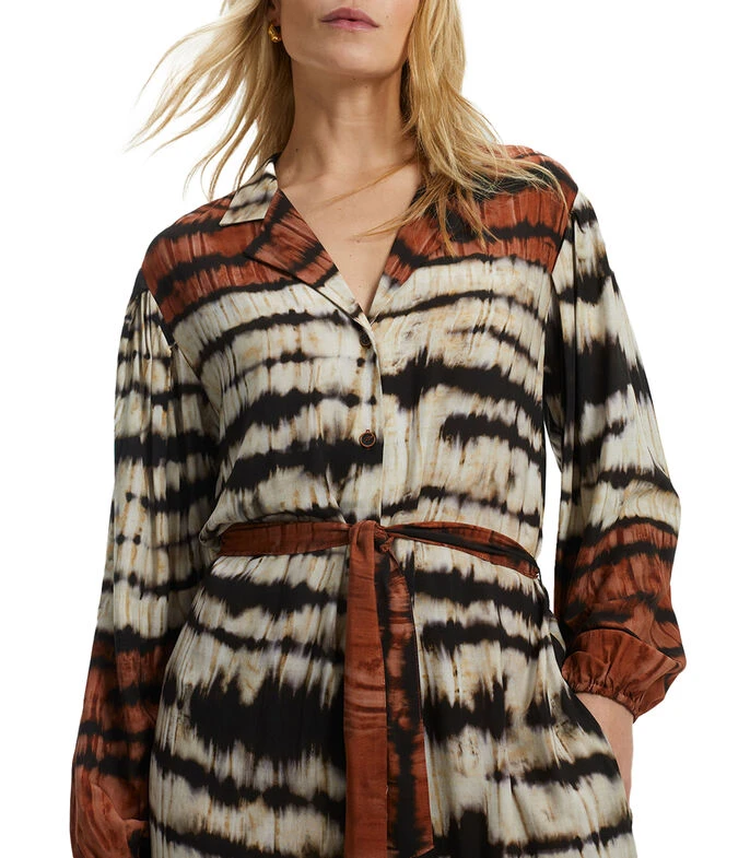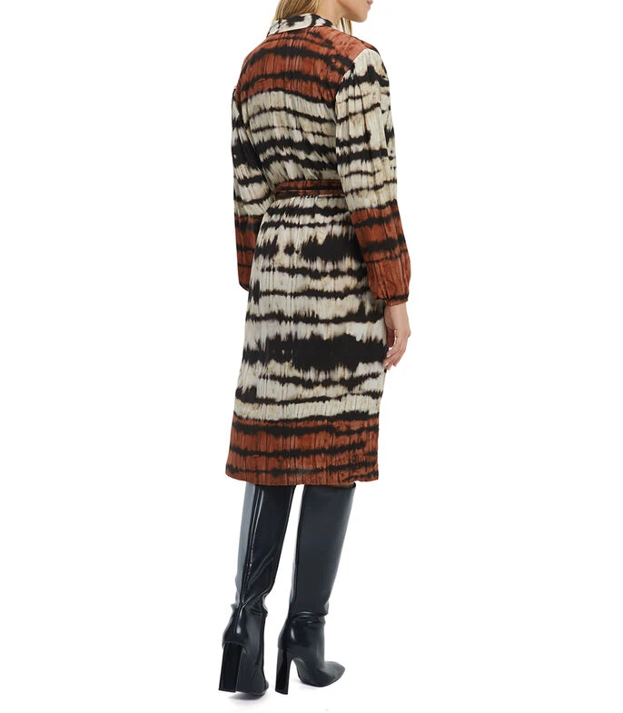Vestido camisero Paz Torras midi de corte evasé en tejido de punto con estampado animalprint, cuello camisero, manga larga con puños elásticos y cinta para anudar en cintura.